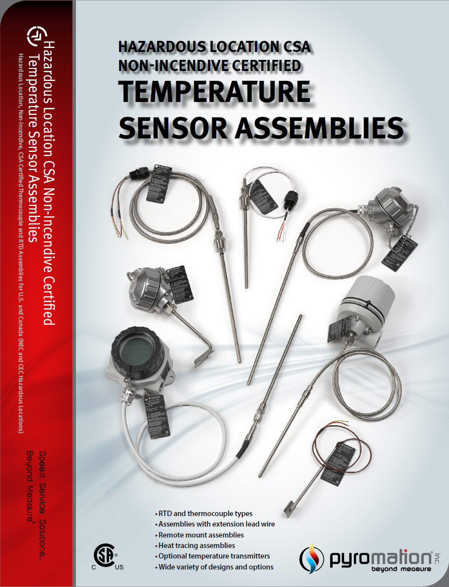 Pyromation’s line of RTD and Thermocouple CSA Certified Non-Incendive Assemblies for use in Hazardous Locations in the U.S. and Canada are shown with various construction options available for each. The product groupings include remote-mount sensors, heat-tracing sensors and assemblies with extension lead wire. Options include assemblies with connection head mounted temperature transmitters.